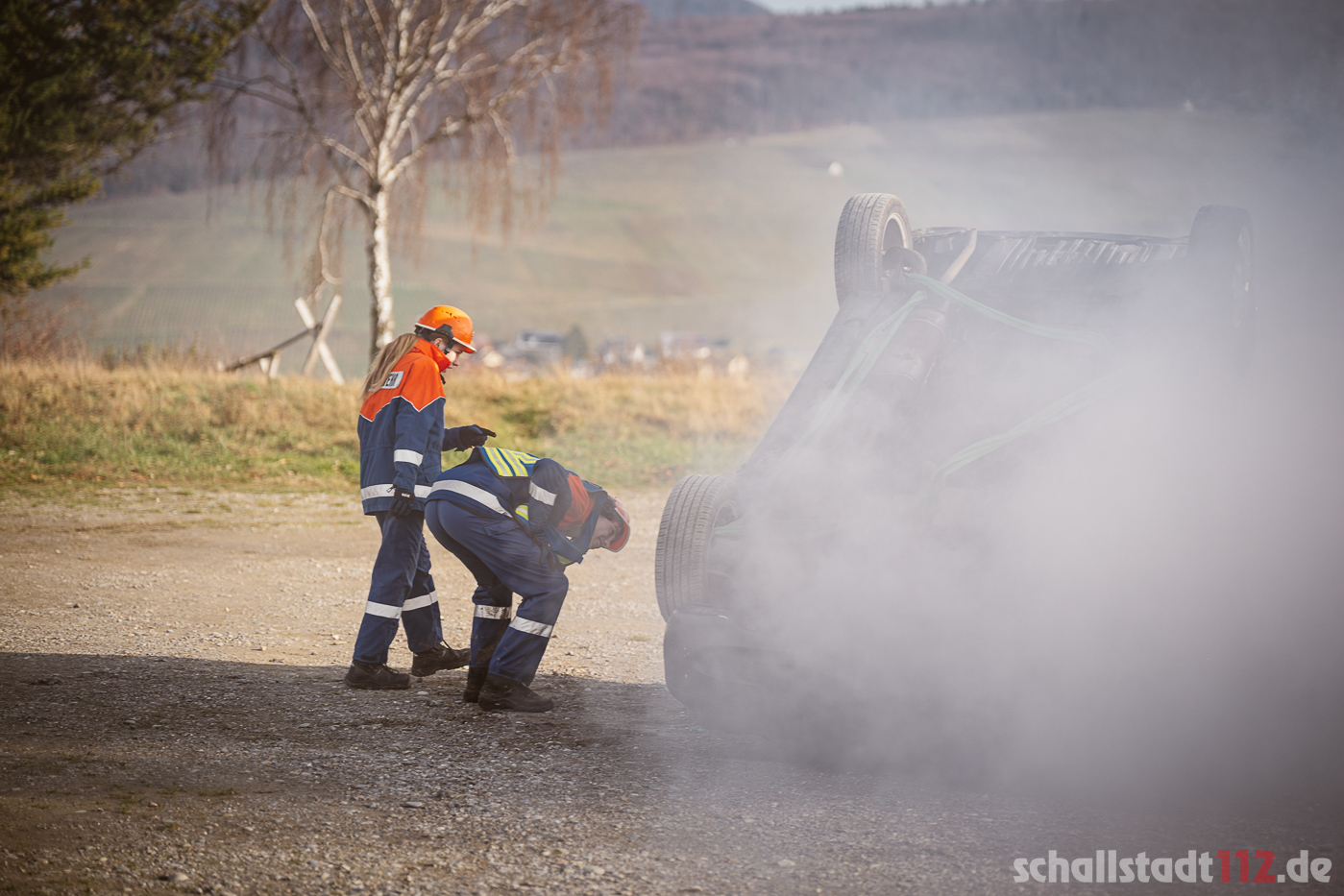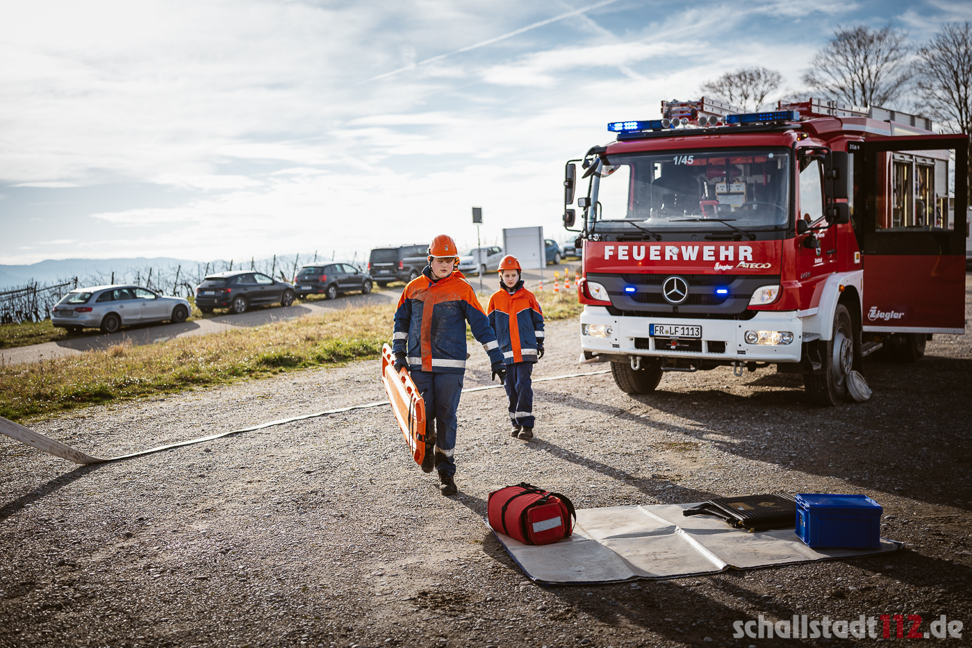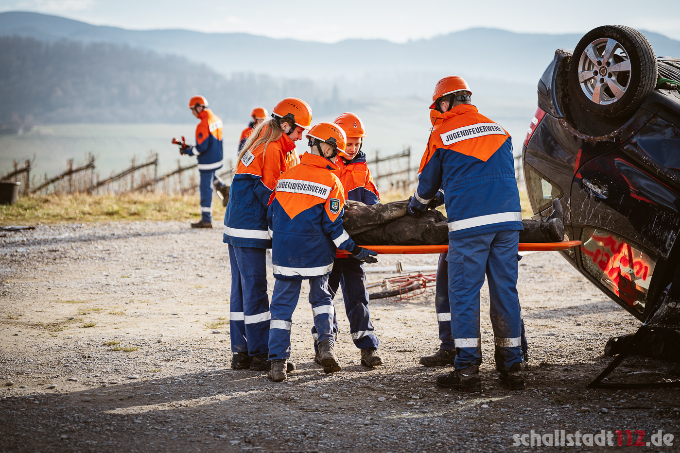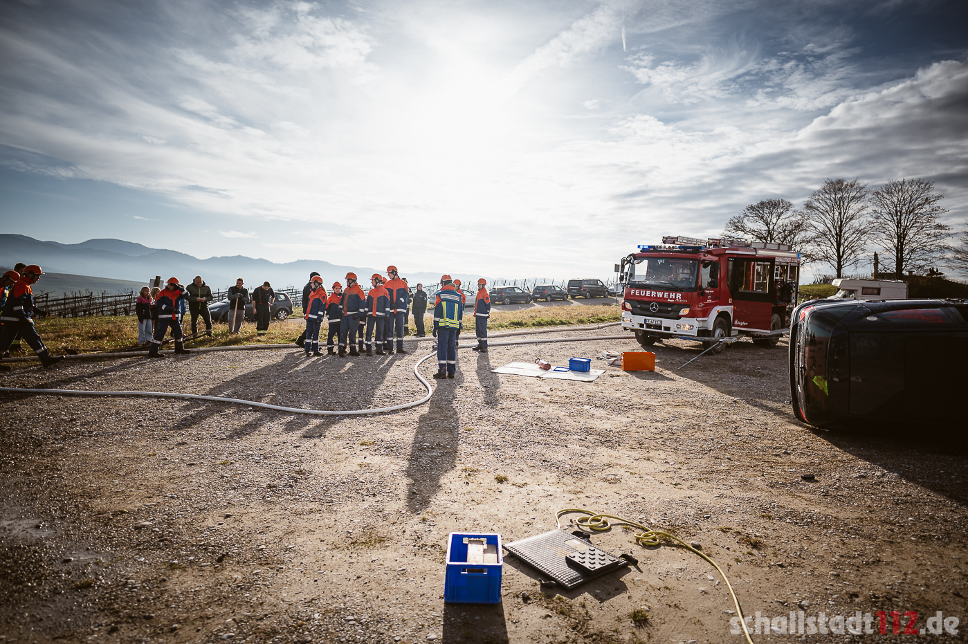 Den krönenden Abschluss bildete am Samstagmittag um 12:00 Uhr eine große Abschlussübung auf dem Batzenberg. Vor den Augen vieler Eltern und Angehöriger galt es, ein komplexes Unfall- und Brandszenario zu bewältigen.