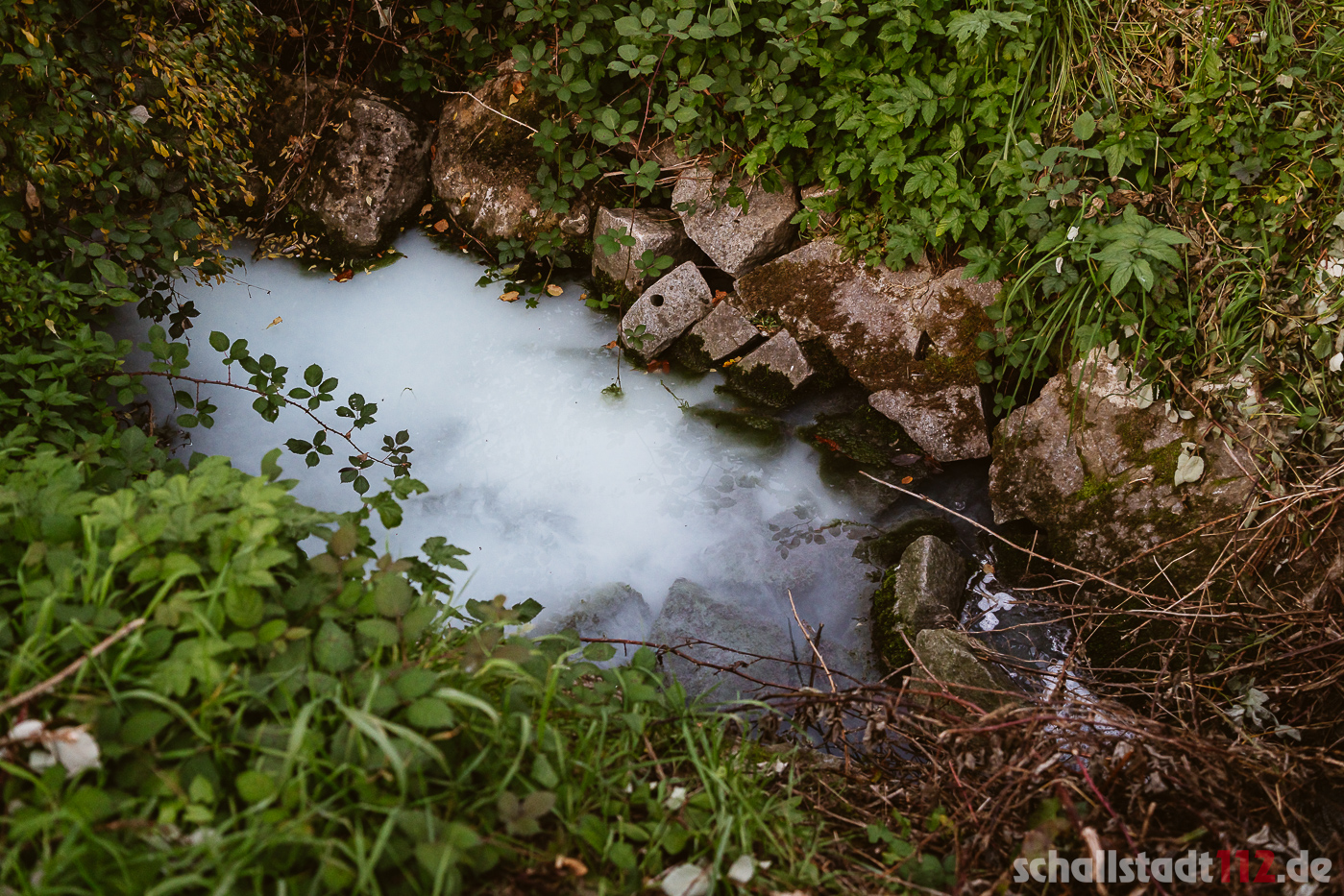 Verfärbung und Geruch liessen auf Dispersionsfarbe schliessen. Die Verschmutzung war schon über eine lange Strecke verteilt. Es floss bereits klares Wasser aus dem unterirdischen Zulauf nach, der eine lange Strecke unter dem Ort verlegt ist.