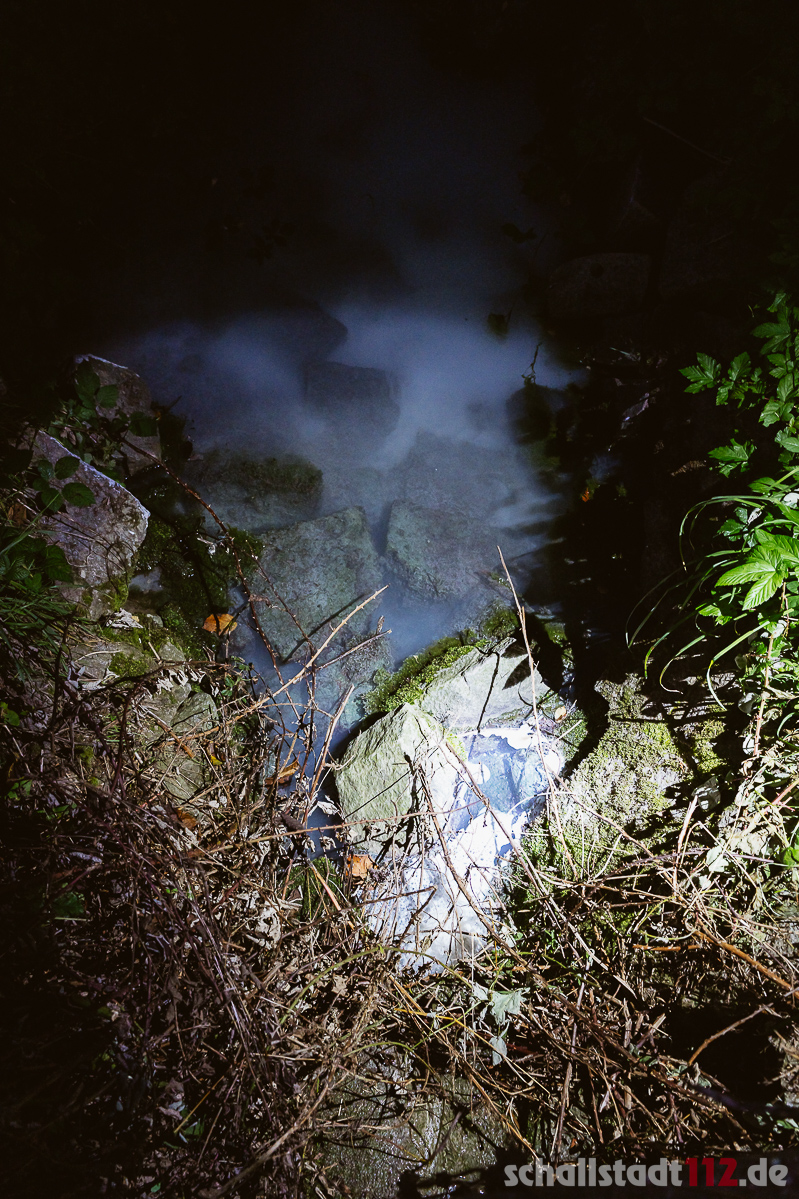 Während wir auf die Ankunft der Polizei warteten, kontrollierten wir Schächte und Zuläufe des Wasserlaufs, konnten aber keine Quelle ausmachen.