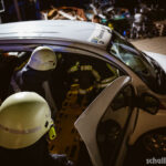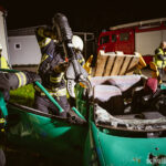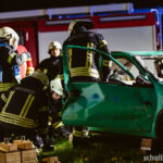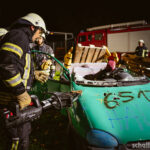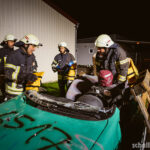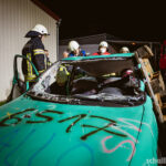 Gruppe 2 übernahm anschließend die Rettung aus dem nun frisch umgebauten „Cabrio“, bei dem der Zugang nun aber bewusst erschwert wurde – Paletten simulierten die beengten Platzverhältnisse an der Einsatzstelle. Hier kam der hydraulische Rettungssatz zum Einsatz, um eine patientenschonende Öffnung des Fahrzeugs zu ermöglichen.