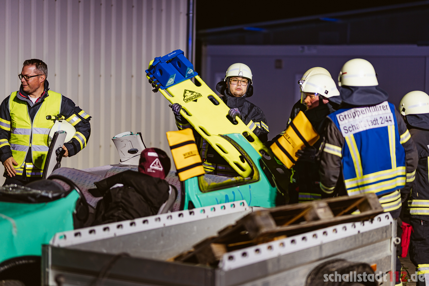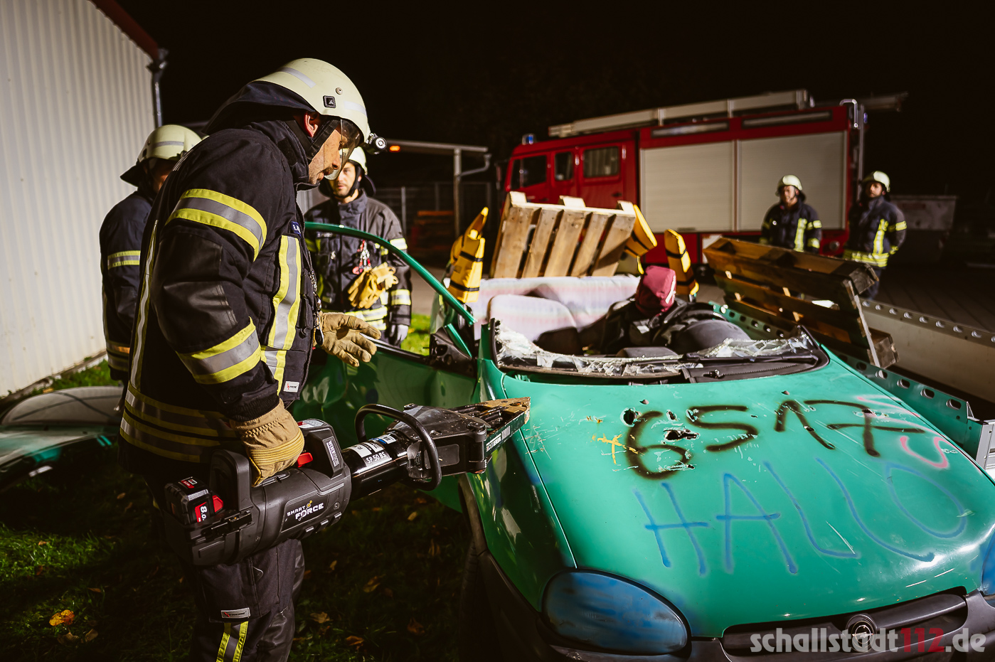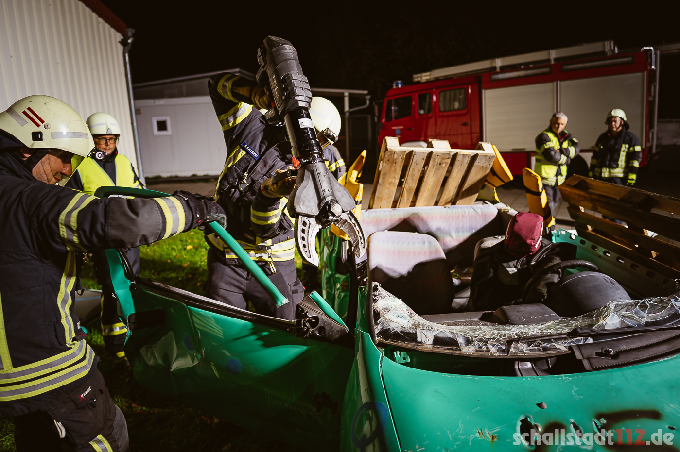 Gruppe 2 übernahm anschließend die Rettung aus dem nun frisch umgebauten „Cabrio“, bei dem der Zugang nun aber bewusst erschwert wurde – Paletten simulierten die beengten Platzverhältnisse an der Einsatzstelle. Hier kam der hydraulische Rettungssatz zum Einsatz, um eine patientenschonende Öffnung des Fahrzeugs zu ermöglichen.