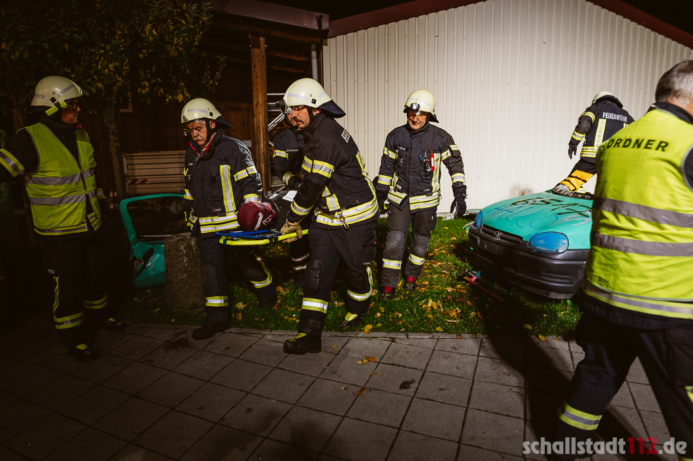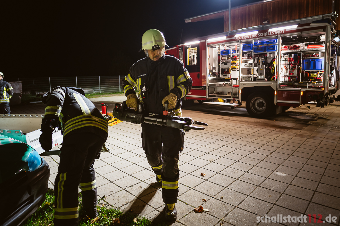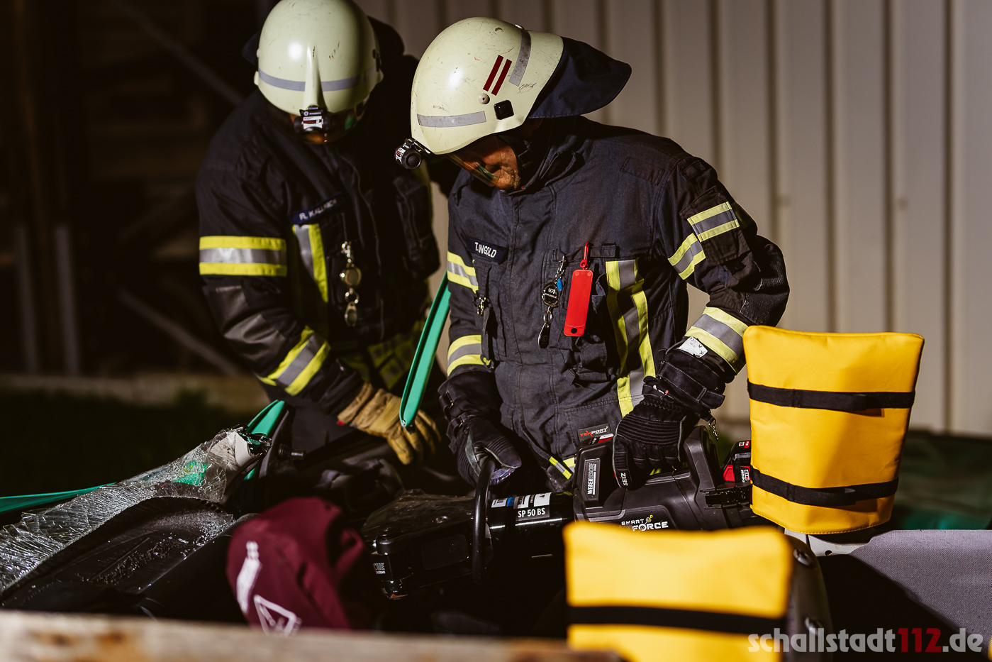 Eine Gruppe arbeitete zunächst an einem Unfallfahrzeug, bei dem das Dach mit der Säbelsäge entfernt werden musste. Der Einsatz des hydraulischen Rettungssatzes war hierbei nicht erforderlich. Nach dem Abtrennen des Daches konnte die eingeschlossene Person schonend aus dem Fahrzeug gerettet werden.