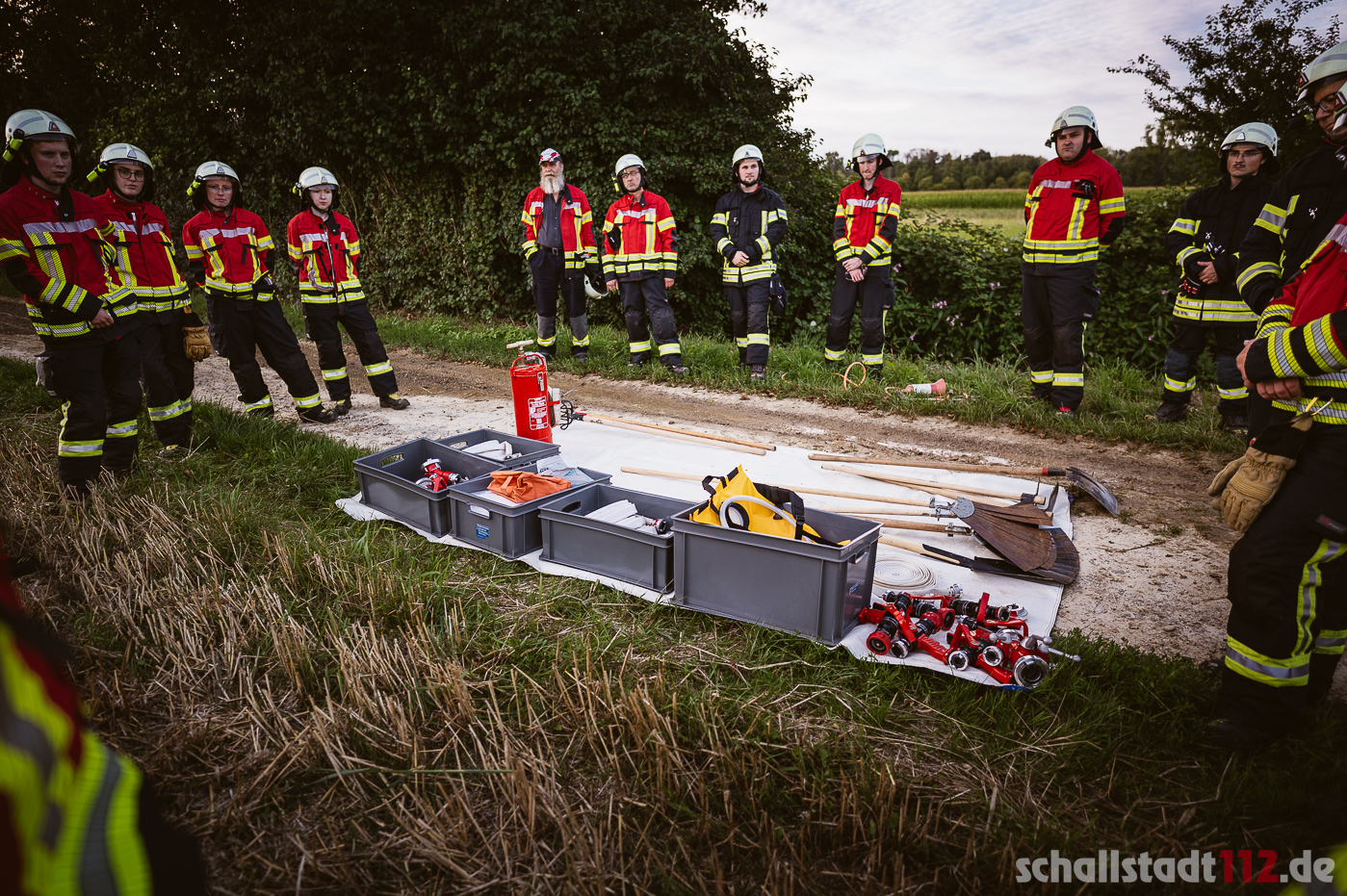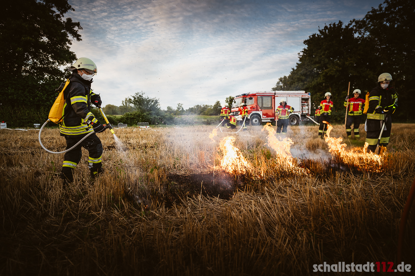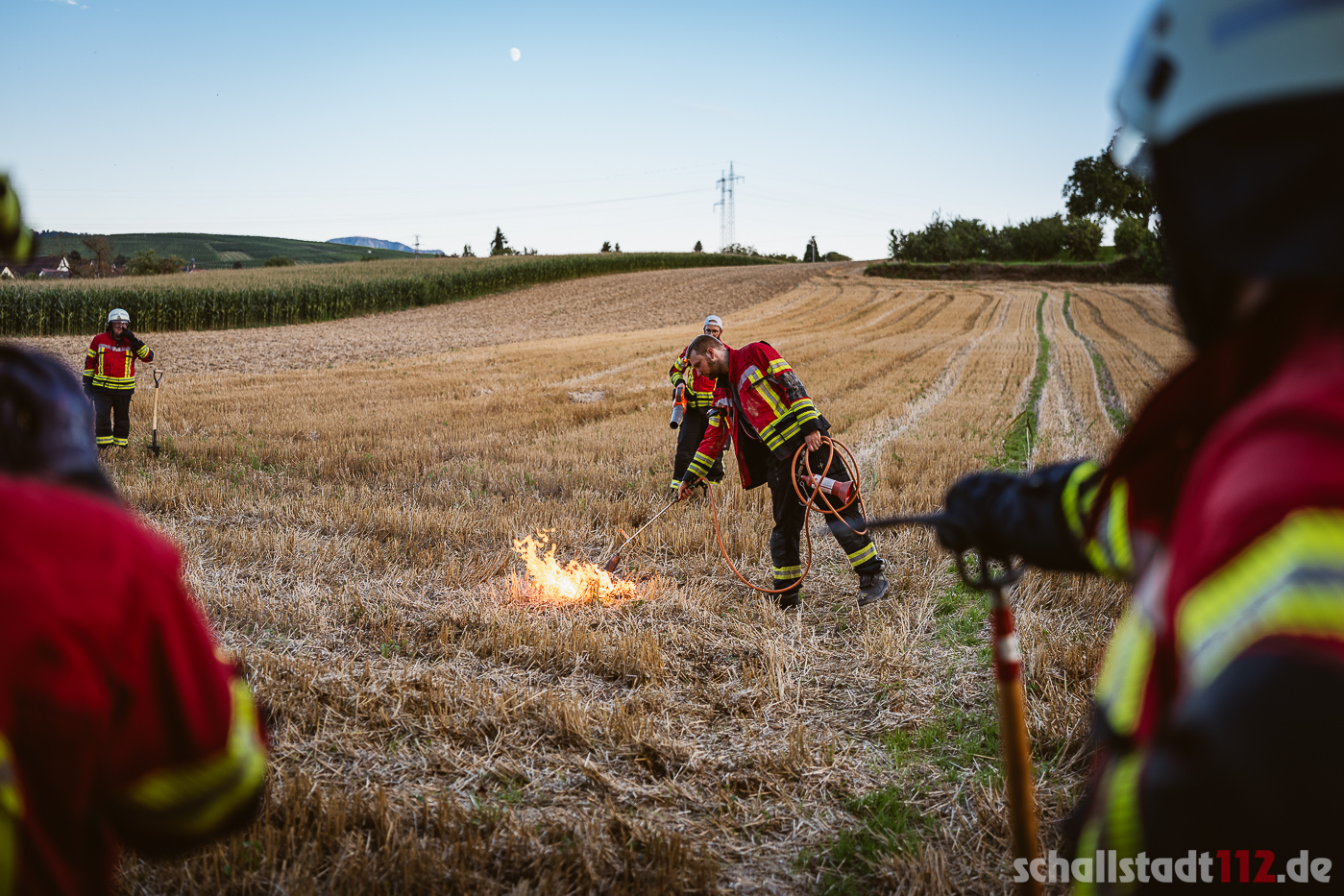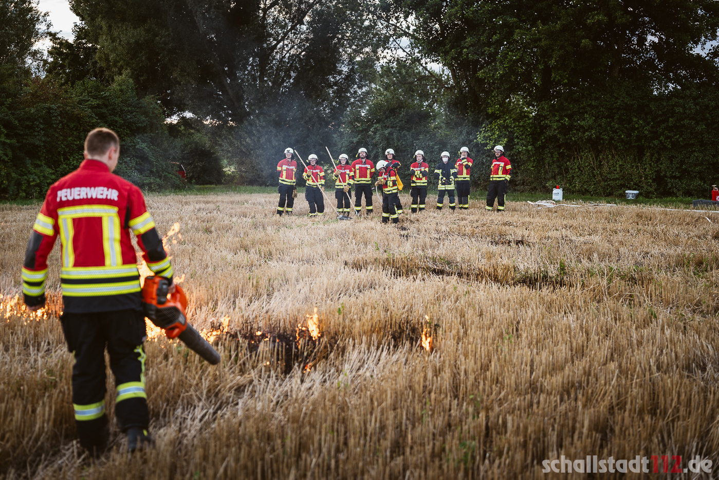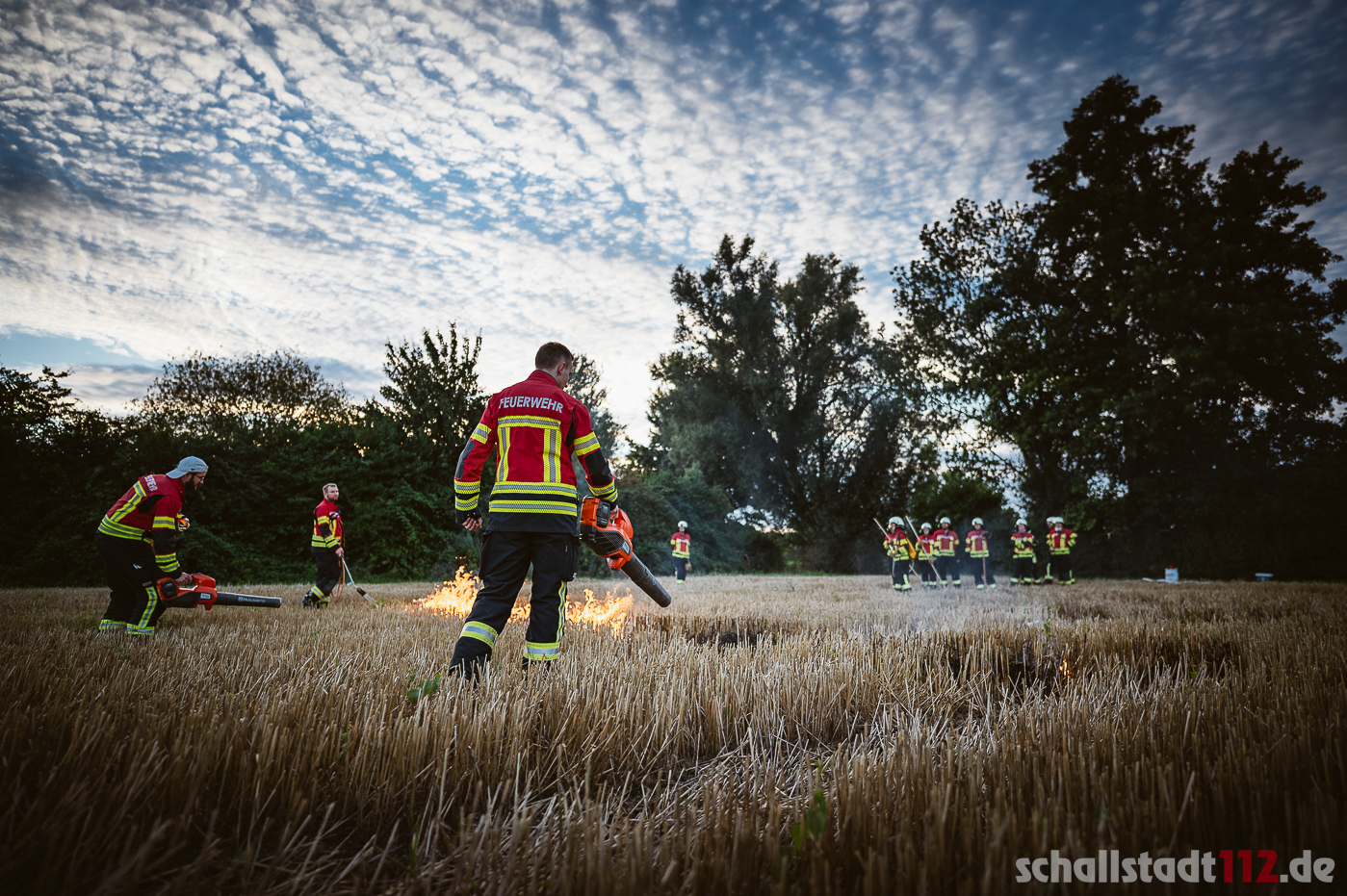 Zum Einsatz kamen Feuerpatschen, Schaufeln, Hacken sowie Löschrucksäcke. Jede Methode hat ihre eigenen Vorteile, je nach Ausbreitungsgeschwindigkeit und Intensität des Feuers. Durch die Nässe der letzten Wochen war der Boden noch feucht, die Stoppeln jedoch größtenteils abgetrocknet. Damit das Feuer während der Übung nicht zu schnell erlosch, wurde es regelmäßig mit Gasbrennern und Laubbläsern wieder angefacht.