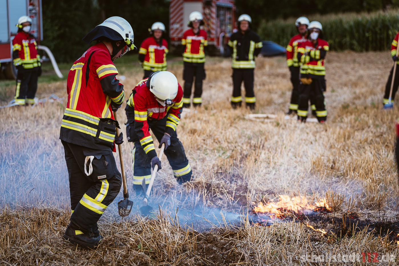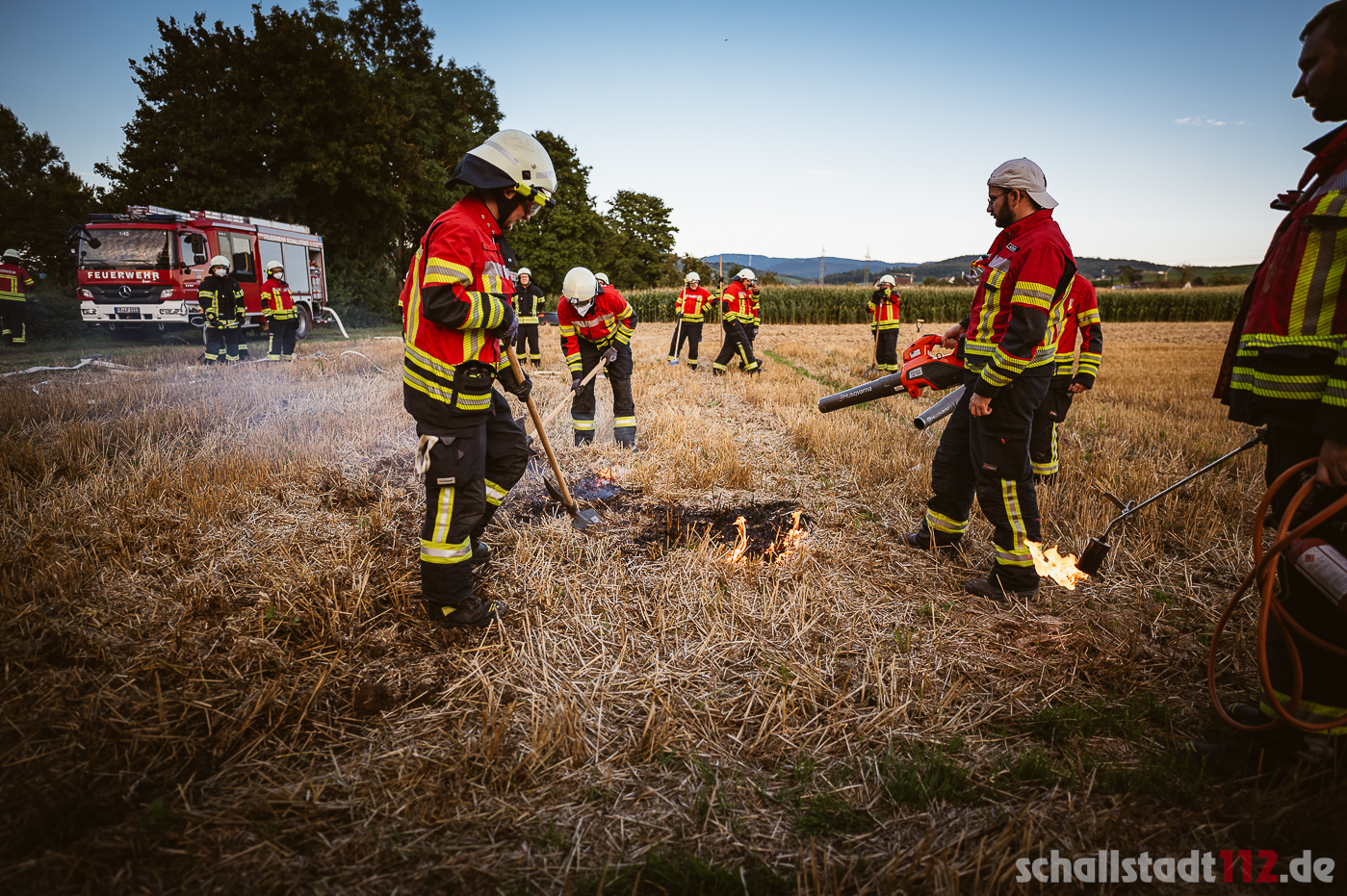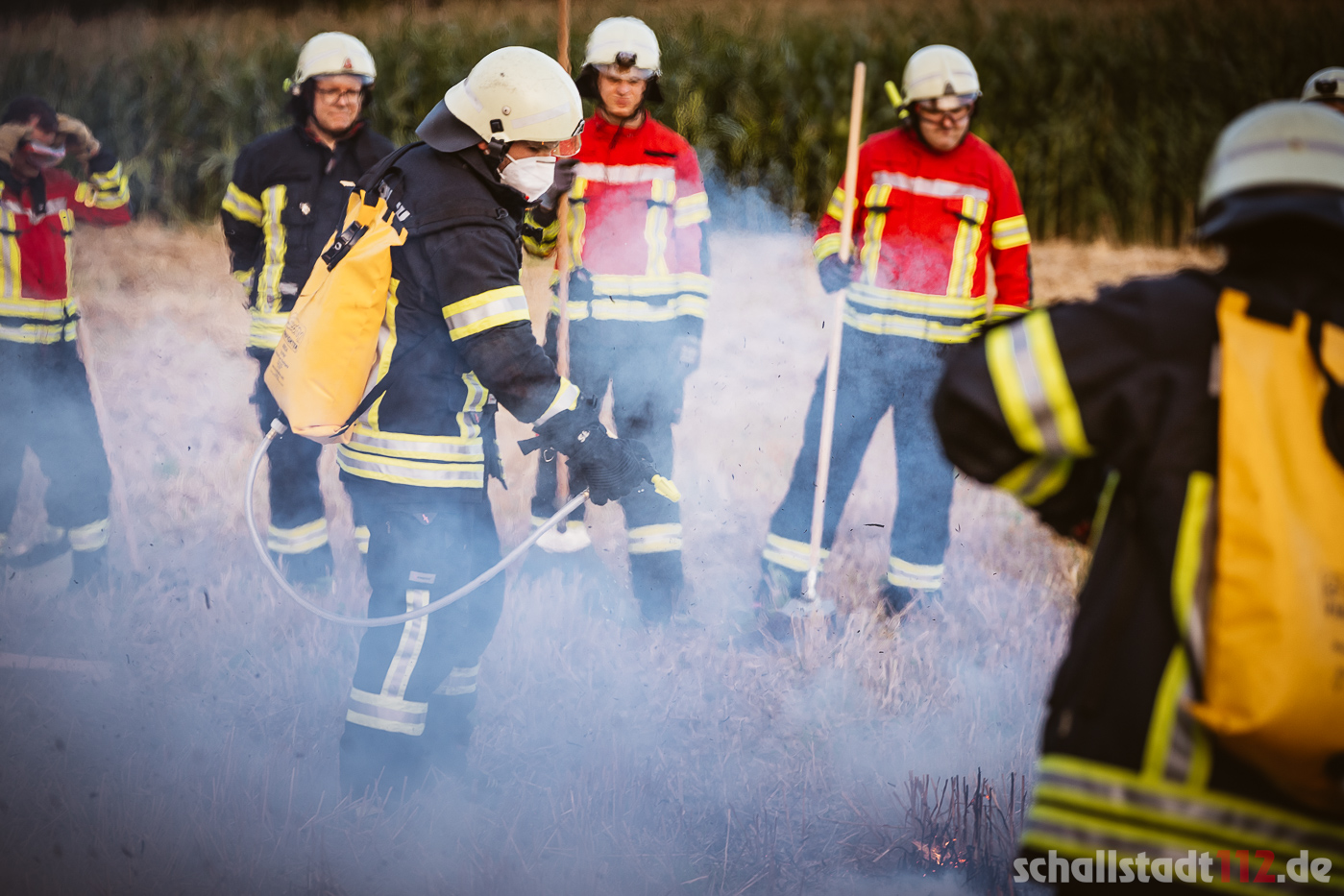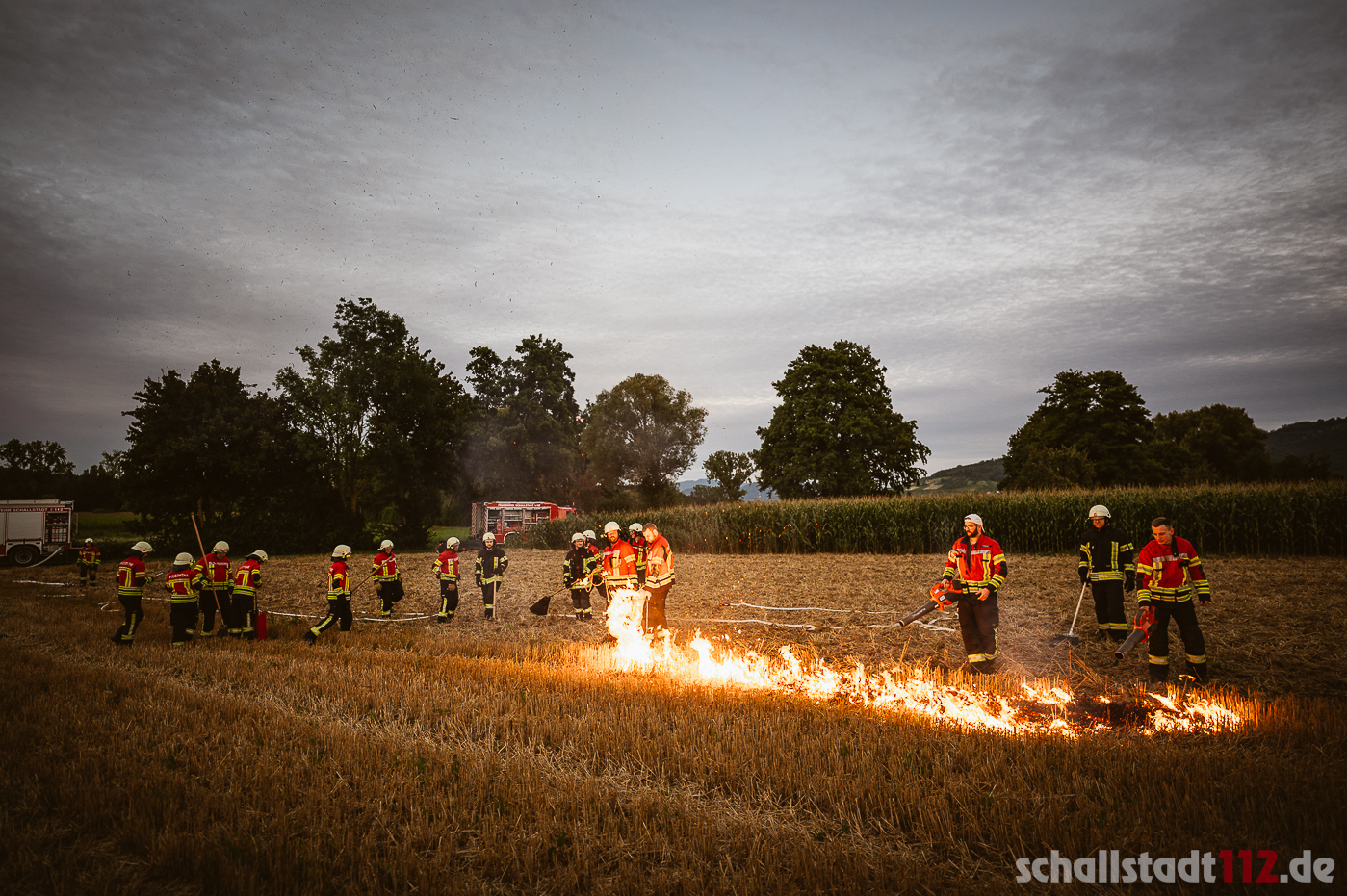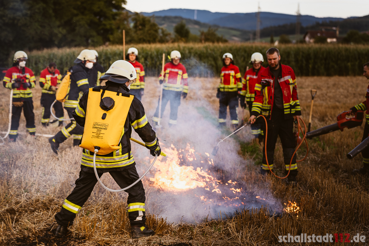 Zum Einsatz kamen Feuerpatschen, Schaufeln, Hacken sowie Löschrucksäcke. Jede Methode hat ihre eigenen Vorteile, je nach Ausbreitungsgeschwindigkeit und Intensität des Feuers. Durch die Nässe der letzten Wochen war der Boden noch feucht, die Stoppeln jedoch größtenteils abgetrocknet. Damit das Feuer während der Übung nicht zu schnell erlosch, wurde es regelmäßig mit Gasbrennern und Laubbläsern wieder angefacht.