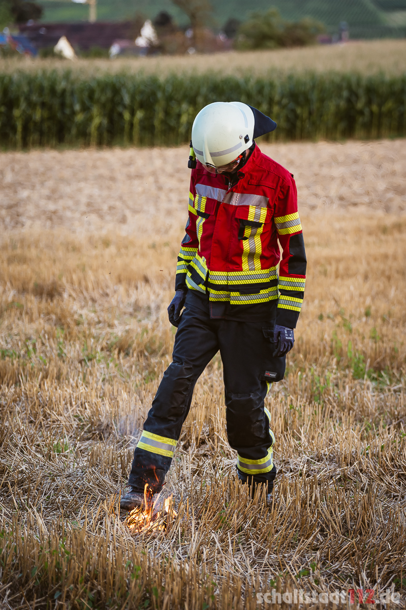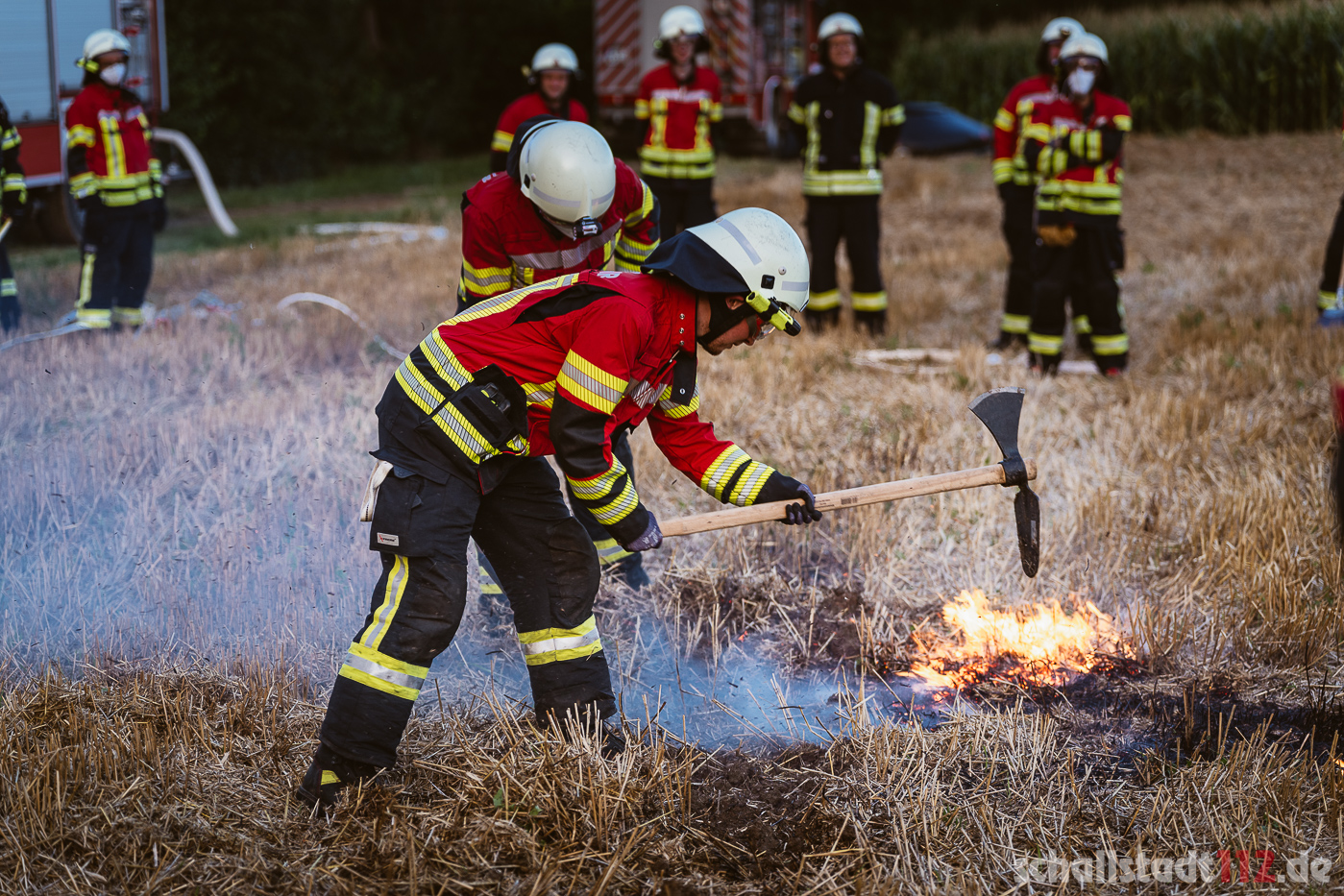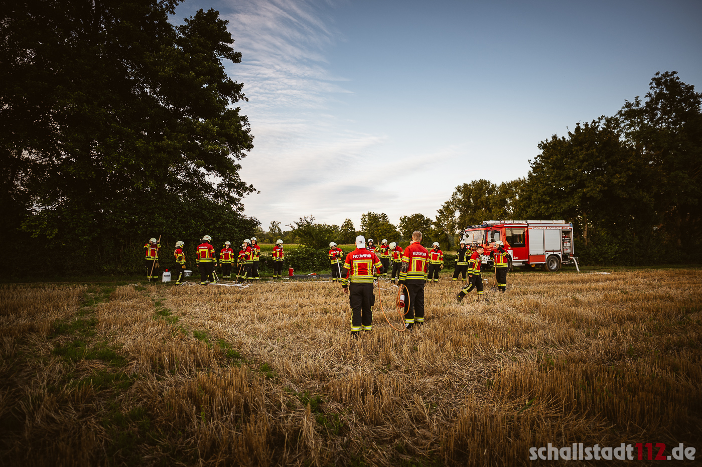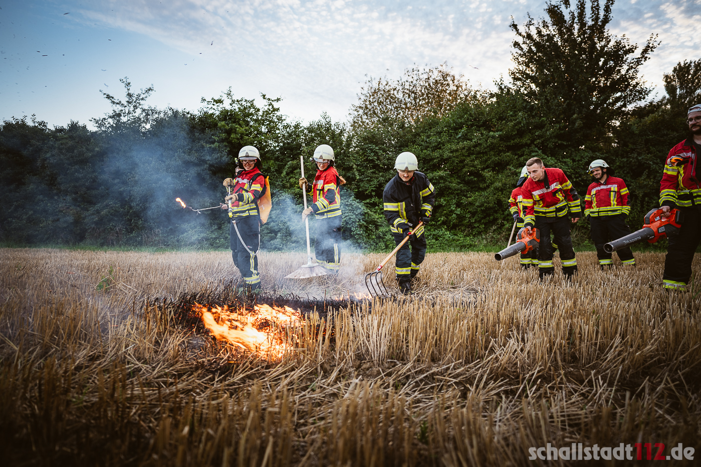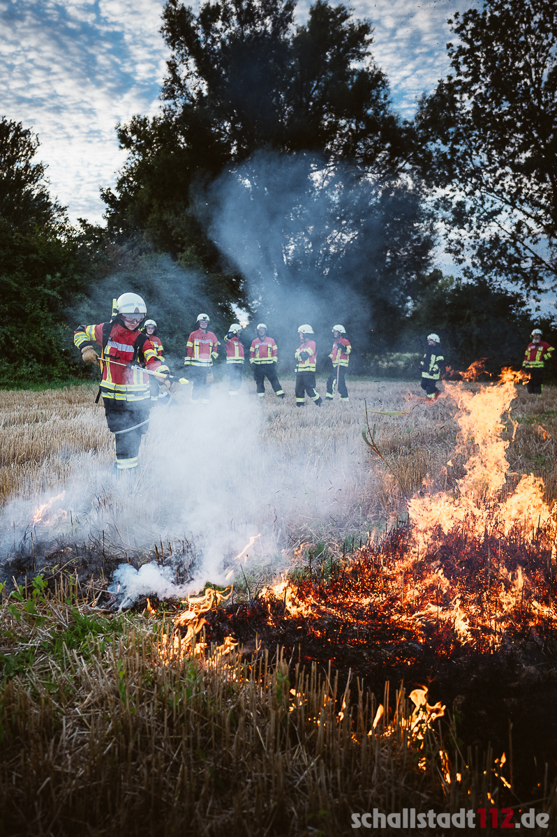 Zum Einsatz kamen Feuerpatschen, Schaufeln, Hacken sowie Löschrucksäcke. Jede Methode hat ihre eigenen Vorteile, je nach Ausbreitungsgeschwindigkeit und Intensität des Feuers. Durch die Nässe der letzten Wochen war der Boden noch feucht, die Stoppeln jedoch größtenteils abgetrocknet. Damit das Feuer während der Übung nicht zu schnell erlosch, wurde es regelmäßig mit Gasbrennern und Laubbläsern wieder angefacht.